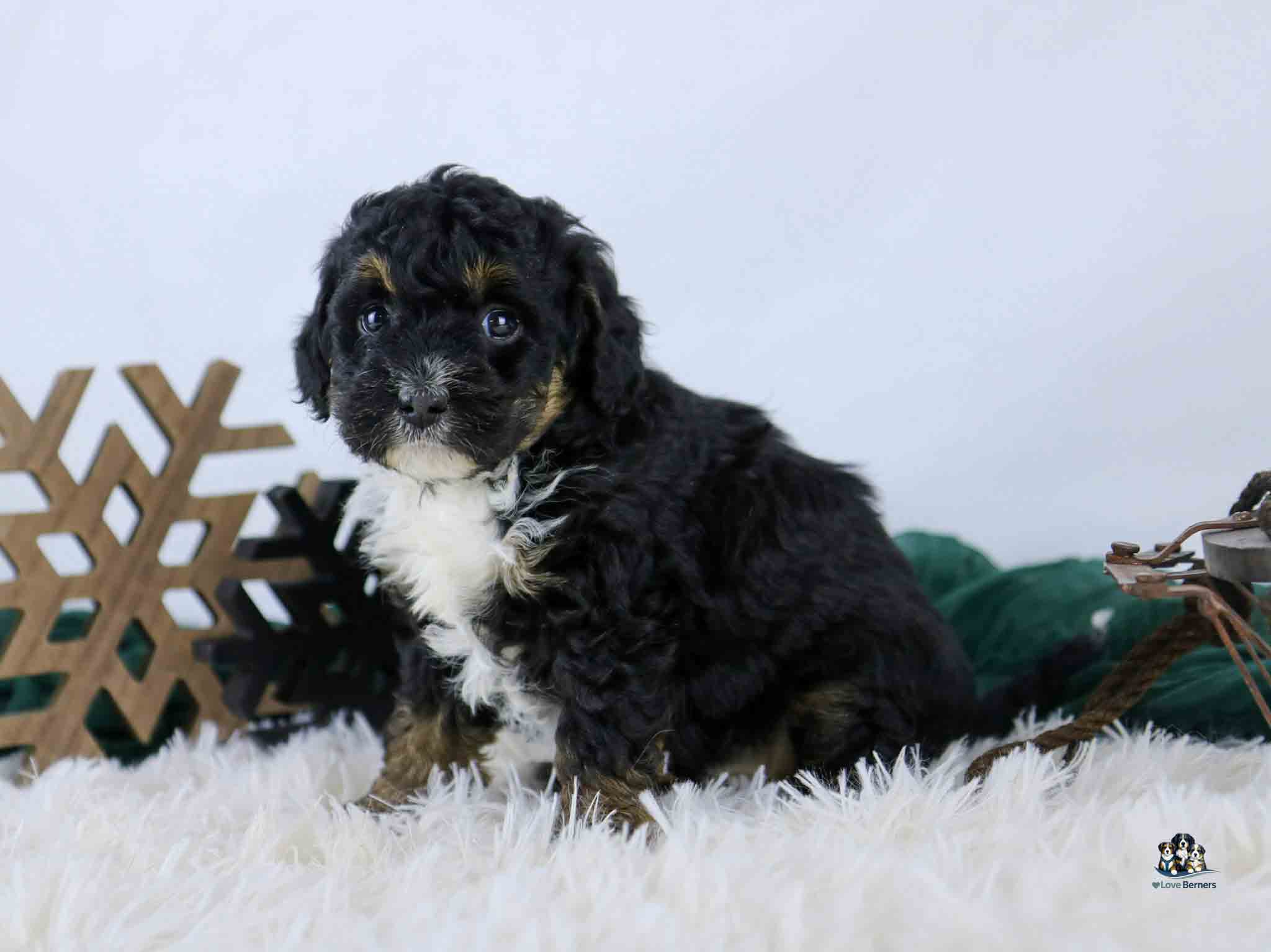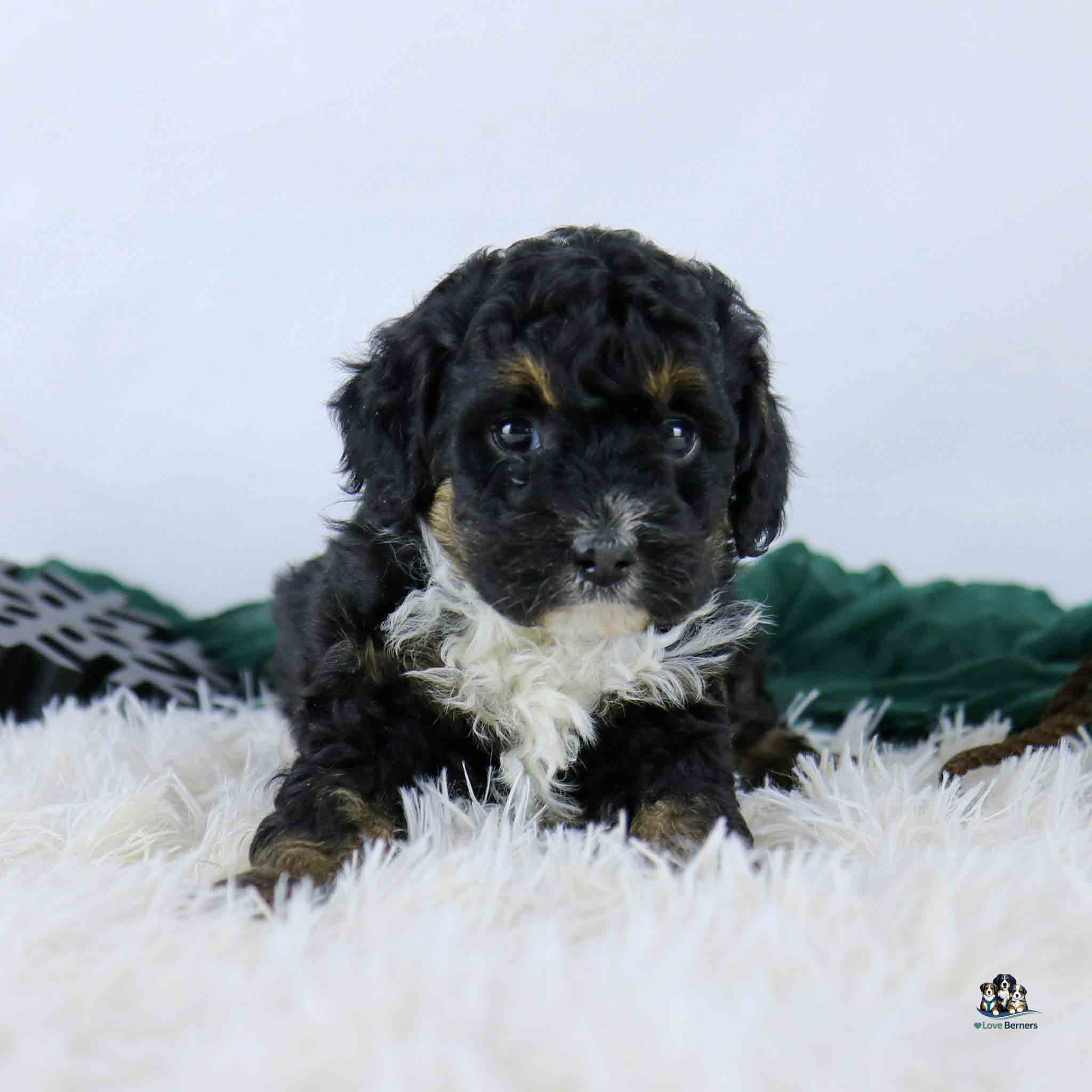 Abby is a tiny black tri Bernedoodle puppy girl with a sweet, gentle personality. She is well socialized and raised in a loving home. Expected to stay small, Abby is a great fit for families or anyone looking for a low-shedding Bernedoodle puppy.