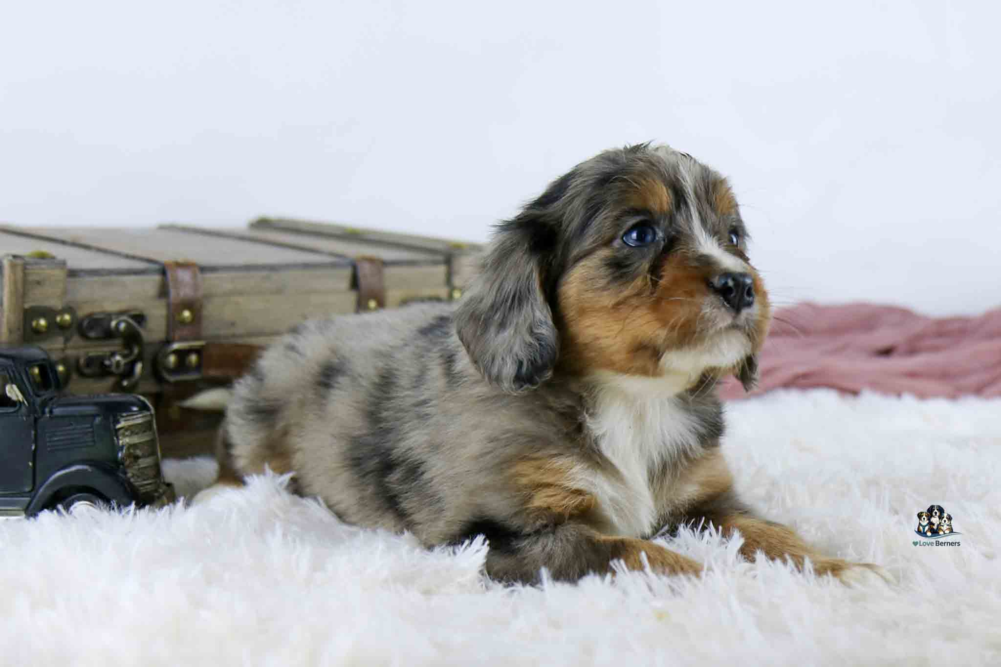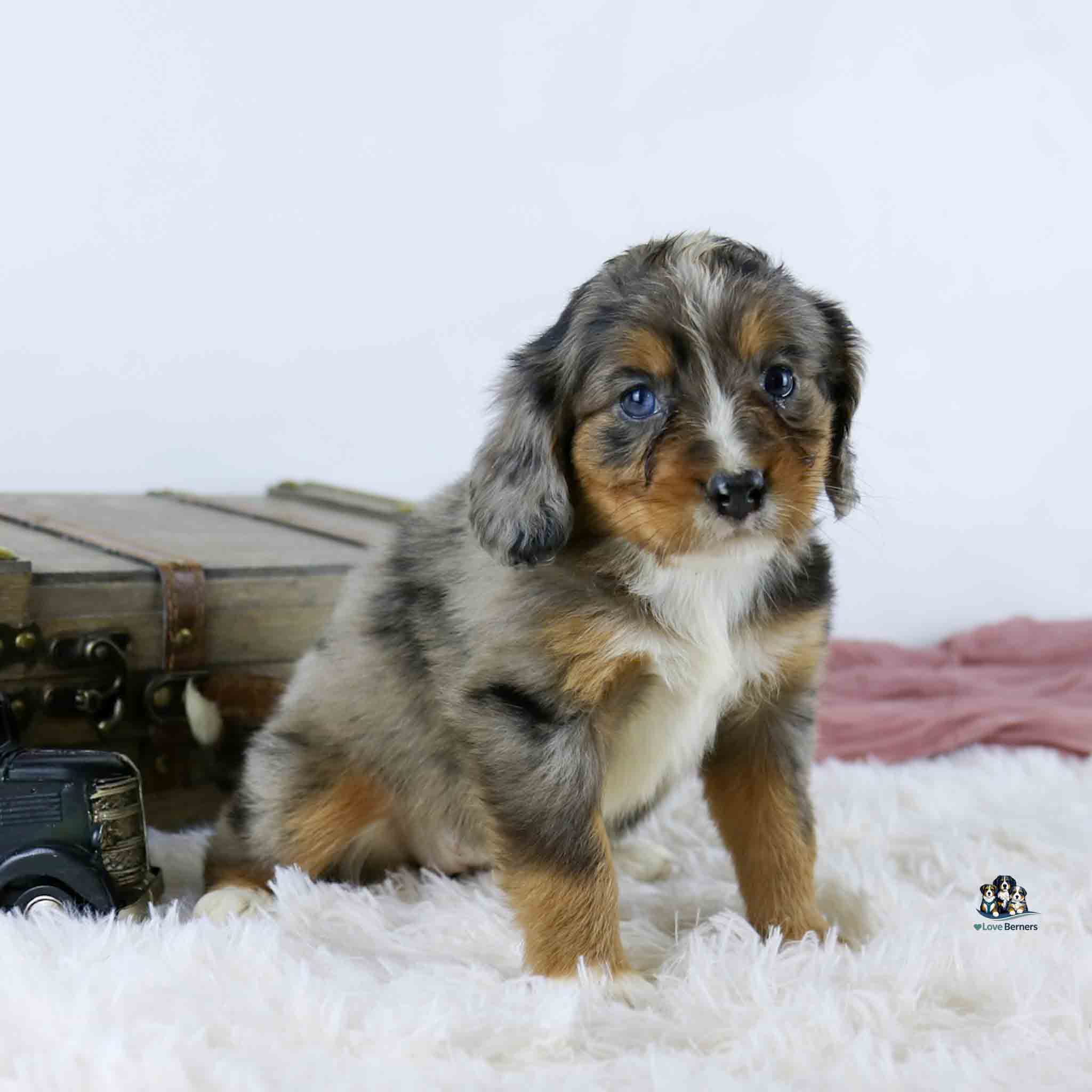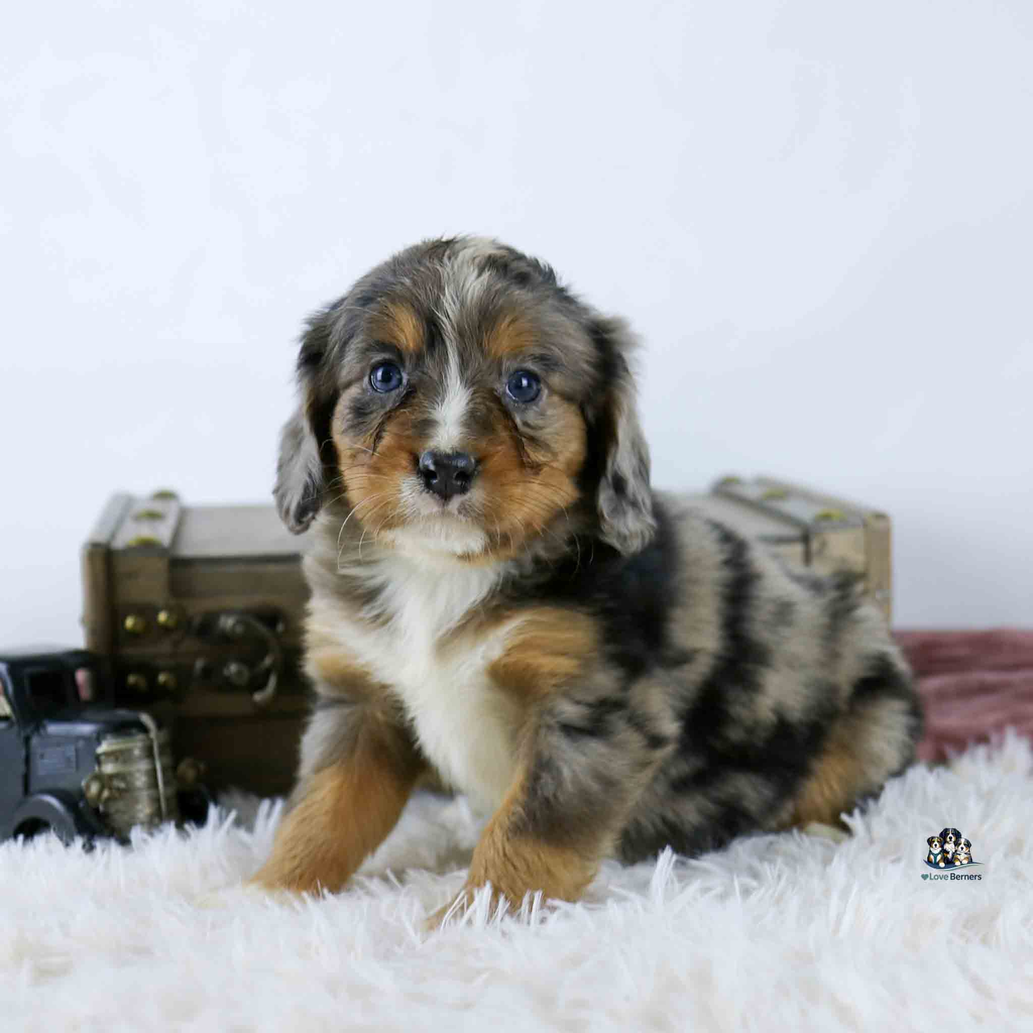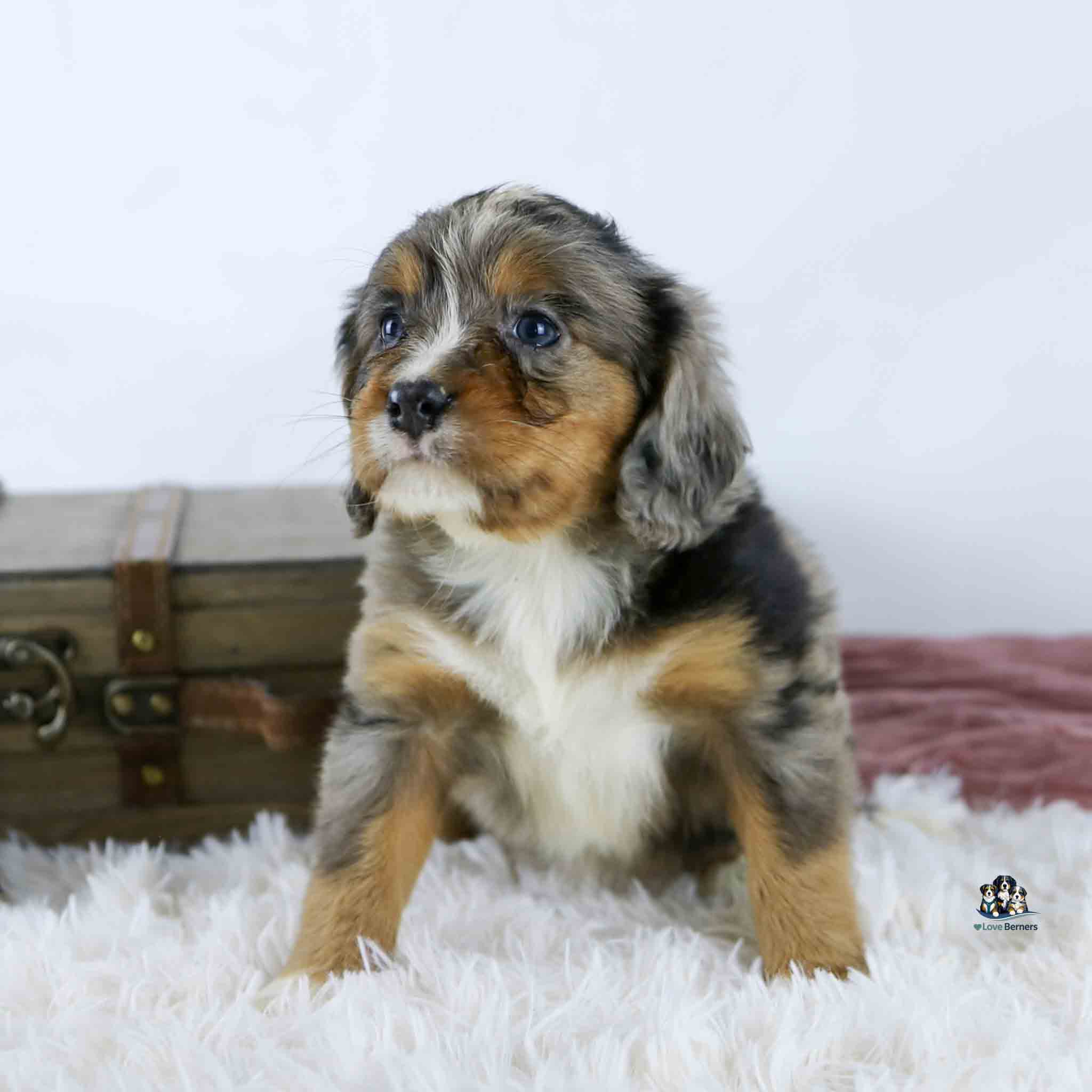 Lany is a Mini Bernese Mountain Dog puppy with the softest merle coat, the sweetest little face, and eyes that say, “you weren’t busy anyway, right?” She’s playful, gentle, and fully committed to being your new shadow.