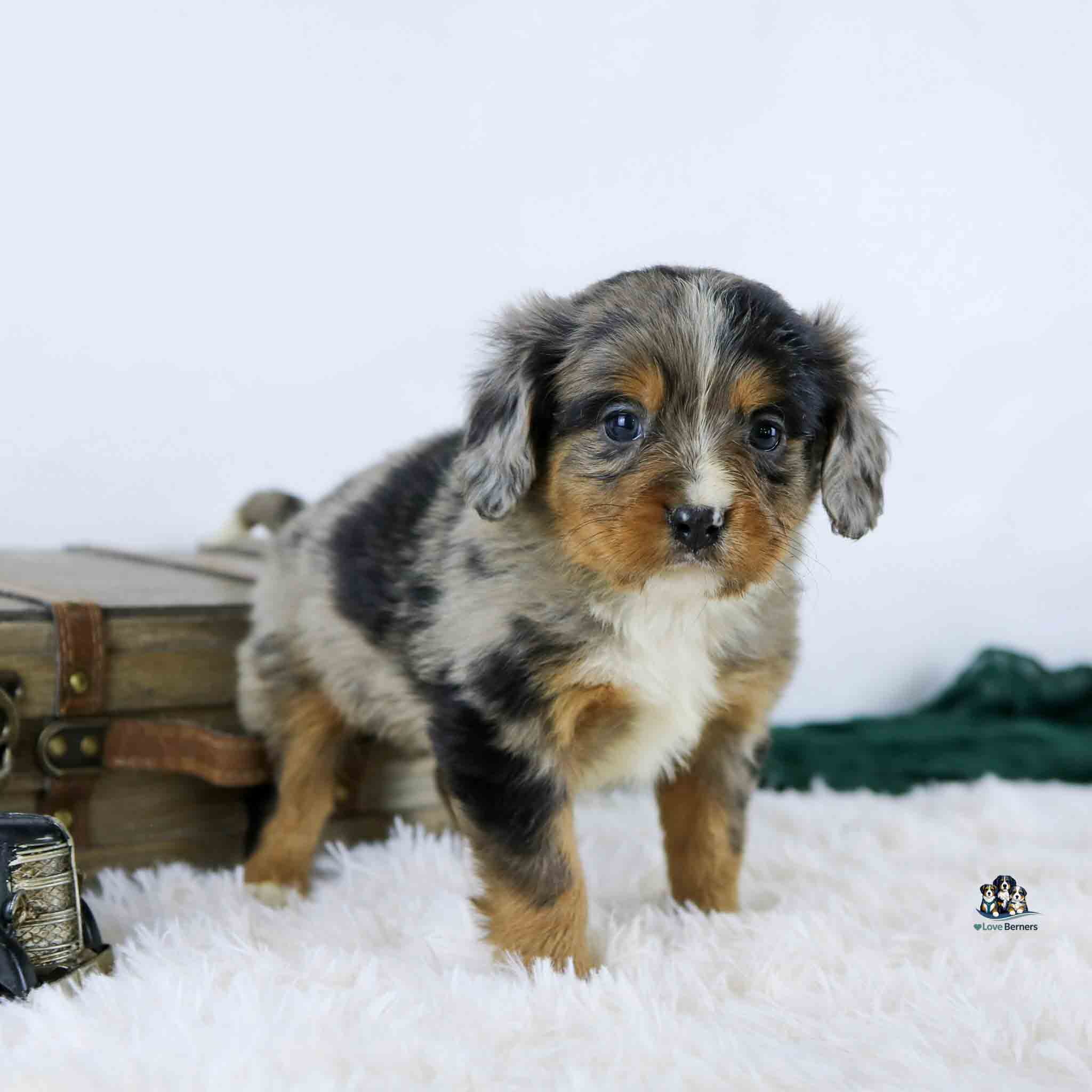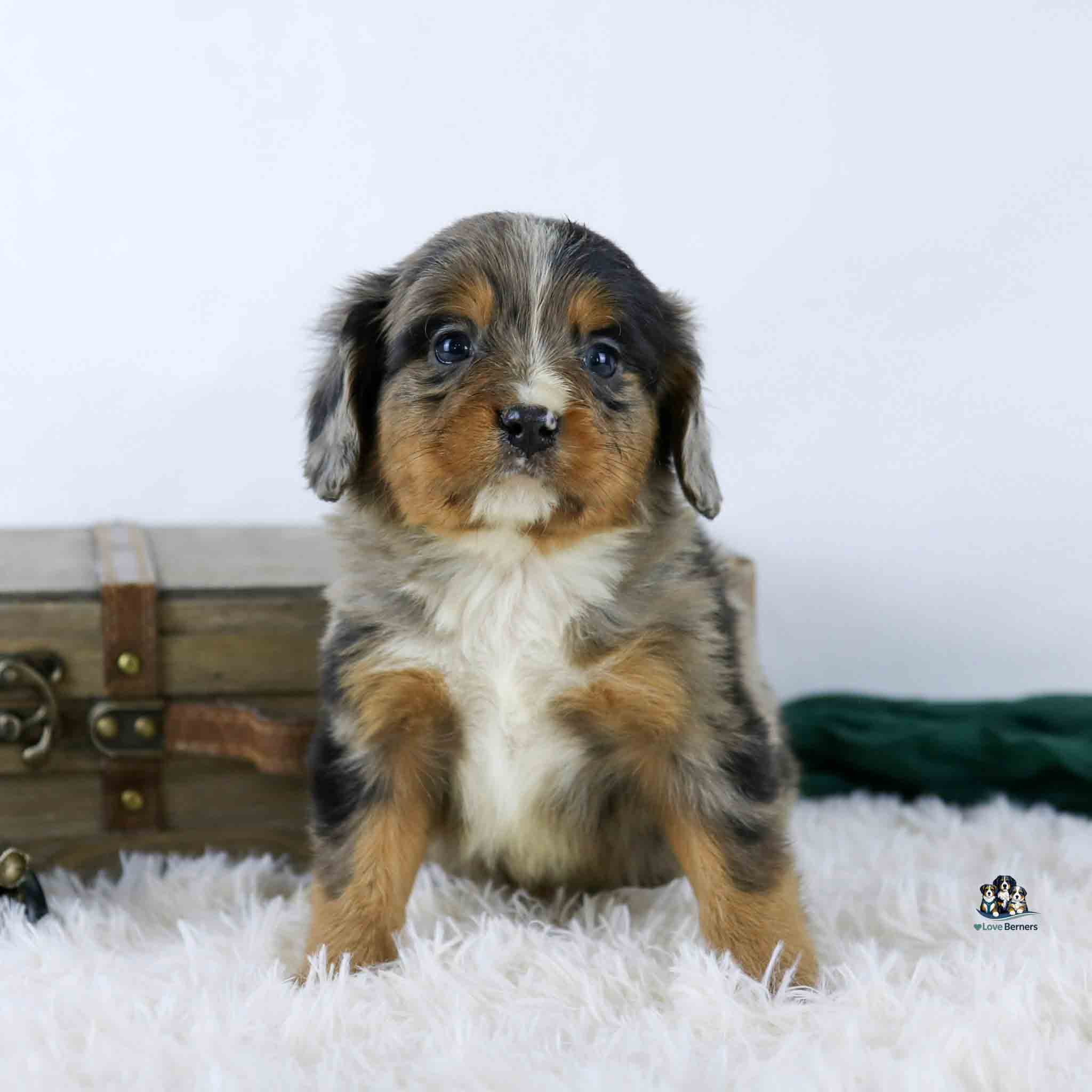 Meet Luck, a Mini Bernese Mountain Dog puppy with the sweetest face and the fluffiest little paws. His soft merle coat and gentle personality make him the perfect cuddle buddy and loyal companion.